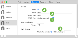 Style Map Family Names: Family name used for bold, italic and bold italic style mapping. You can use this to create subfamilies within larger font families. ‘Up to four fonts can share the Font Family name, forming a font style linking group (regular, italic, bold, bold italic – as defined by OS/2.fsSelection bit settings). Glyphs uses the entries in Style Name field and in the Style Linking section of the instance for linking the four individual weights.